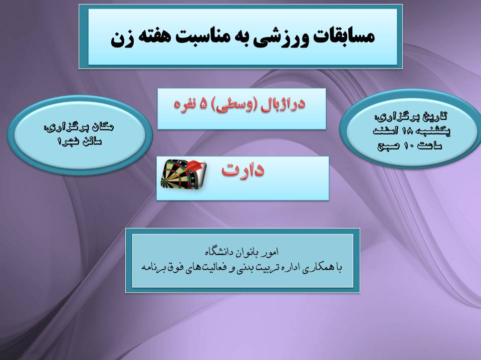 به مناسبت میلاد بانوی دو عالم حضرت فاطمه زهرا (س) و روز بزرگداشت مقام شامخ زن، برنامه های مختلفی توسط دفتر امور بانوان دانشگاه و با مشارکت روابط عمومی، معاونت فرهنگی و اجتماعی و اداره تربیت بدنی و فعالیت های فوق برنامه دانشگاه برگزار می شود. برنامه های هفته زن در دانشگاه: ۱- برگزاری کارگاه آموزشی با موضوع "سلامت قلب و عروق و تغذیه مناسب" همراه با گواهی آموزش کارکنان – ویژه خانم ها و آقایان زمان: یکشنبه ۱۵ اسفند ماه ساعت ۱۲-۱۰ مکان: تالار حکمت ۲– مسابقات دارت و وسطی زمان: چهار شنبه ۱۸ اسفند ماه ساعت ۱۲-۱۰ مکان: سالن فجر ۳- مسابقه شعر مادر زمان ارسال آثار از ۱۴ تا ۲۰ اسفند ماه نحوه برگزاری مسابقه شعر مادر : همکارانی که مایل به شرکت در این مسابقه می باشند می توانند شعر یا دکلمه ای در ارتباط با موضوع مادر را با صدای خود یا مادرشان ضبط نمایند و در انتهای فایل صوتی نام، نام خانوادگی و شماره همراه خود را ذکر کنند و آن را به آدرس ایدی (@unibano) https://telegram.me/unibano ارسال نمایند. مدت زمان کل فایل صوتی ارسالی حداکثر ۳ دقیقه باشد و فایل های صوتی خارج از چارچوب مذکور در فرآیند داوری قرار نخواهد گرفت. ۴- مسابقه حدیث زمان ارسال آثار از ۱۴ تا ۲۰ اسفند ماه موضوع ارسالی: حدیث یا آیه ای از قرآن کریم با محوریت نقش زن در خانواده و در جامعه همراه با ذکر منبع و به صورت یک متن واحد نه بصورت مجزا به آدرس ایدی (@unibano) https://telegram.me/unibano ارسال شود . مثالی از متن ارسالی: إنّا أعطَيناكَ الكَوثَرَ فَصَلِّ لِرَبِّكَ وَانْحَر . همانا ما كوثر را به تو عطا كرديم پس براي پروردگارت نماز بخوان و قرباني كن. نام و نام خانوادگی، واحد محل خدمت – ….۰۹۱۱۱۳۱ ۵- برنامه پیاده روی همگانی با اهدای جوایز زمان: دوشنبه ۲۳ اسفند ماه محل برگزاری: سازمان مرکزی – دانشکده کشاورزی – ساختمان کلاس های آموزشی – مزار شهدای گمنام دانشگاه ۶- مراسم بزرگداشت روز زن در دانشگاه زمان: سه شنبه ۲۴ اسفند ساعت ۱۲ – ۱۰ مکان: تالار حکمت