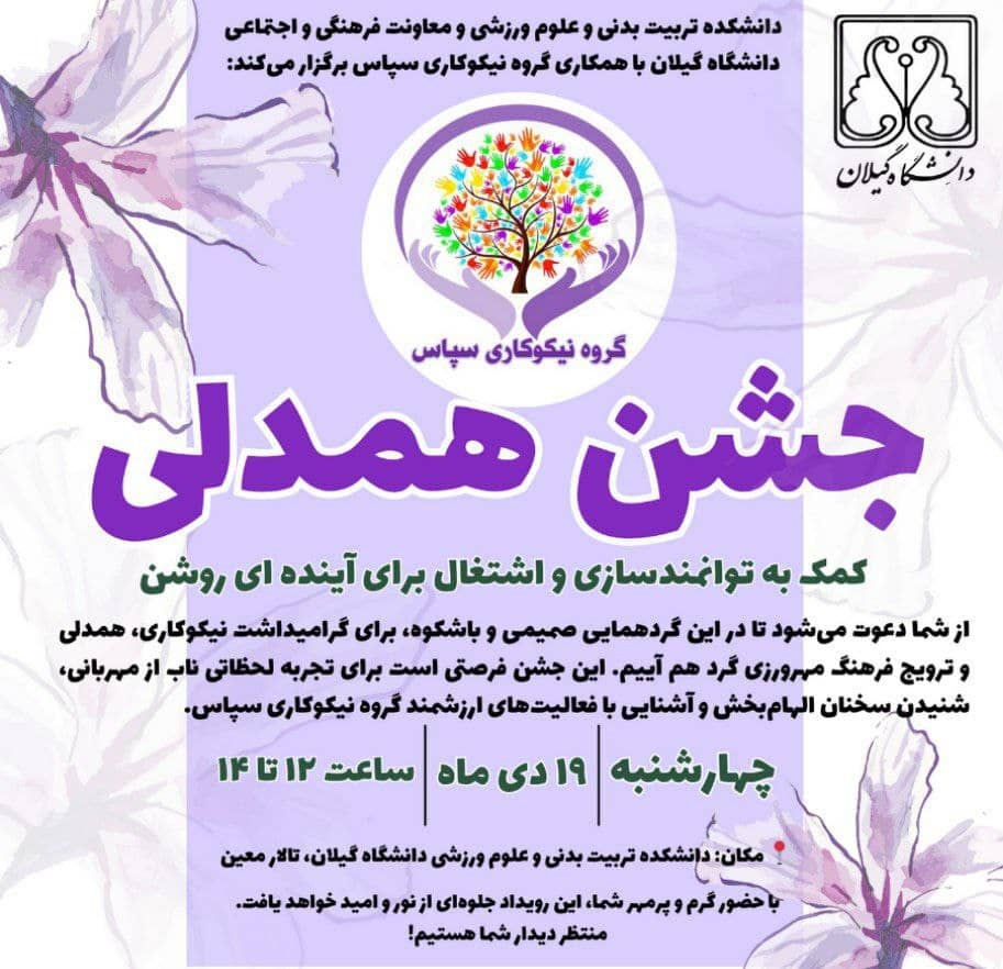 دانشکده تربیت بدنی و علوم ورزشی دانشگاه گیلان و گروه نیکوکاری سپاس، شما رو به گردهمایی صمیمی و باشکوهی برای گرامیداشت نیکوکاری و مهرورزی دعوت میکنند. لحظاتی ناب از مهربانی و شنیدن سخنان الهامبخش رو تجربه کنید.