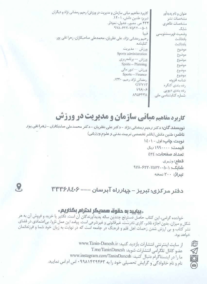 کتاب کاربرد مفاهیم مبانی سازمان و مدیریت در ورزش تالیف دکتر رحیم رمضانی نژاد ، استاد مدیریت ورزشی دانشکده تربیت بدنی و علوم ورزشی دانشگاه گیلان و همکاران در 434 صفحه از سوی انتشارات طنین دانش در سال 1401 به چاپ رسید.