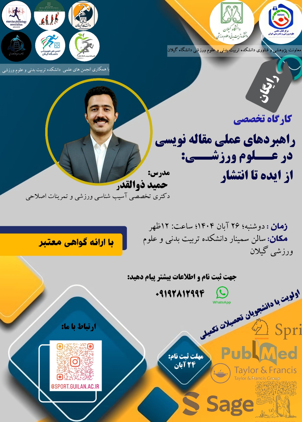 با تلاش معاونت پژوهشی و قطب علمی ورزش و تندرستی دانشگاه گیلان، سومین همایش دانشجویی ورزش و فرهنگ‌سازی اجتماعی در حوزه‌های فیزیولوژی و تغذیه ورزشی، آسیب‌شناسی ورزشی و حرکات اصلاحی، مدیریت ورزشی، و بیومکانیک ورزشی برگزار شد.  در این همایش که از ساعت ۱۰ صبح روز ۲۴ آذر ۱۴۰۴ آغاز شد، دانشجویان منتخب مقالات خود با موضوعات متنوع و جدید را در ۱۰ دقیقه ارائه کردند و سپس پرسش و پاسخ در پنل‌ تخصصی با حضور آقایان دکتر حامد زارعی، محمدجواد ضیا، مسعود خرسندی و مجتبی محمدی انجام شد. سخنرانان برتر: یاسمین احمدی در پنل فیزیولوژی ورزشی امید شاهانی در پنل آسیب‌شناسی ورزشی و حرکات اصلاحی مهیا شعبانی در پنل مدیریت ورزشی محمدرضا مولوی در پنل بیومکانیک ورزشی با تشکر از کلیه دست‌اندرکاران این همایش به‌ویژه دکتر جواد مهربانی، خانم شیرین بشری، دکتر حمید ذوالقدر و کلیه اعضای انجمن‌های علمی دانشکده.
