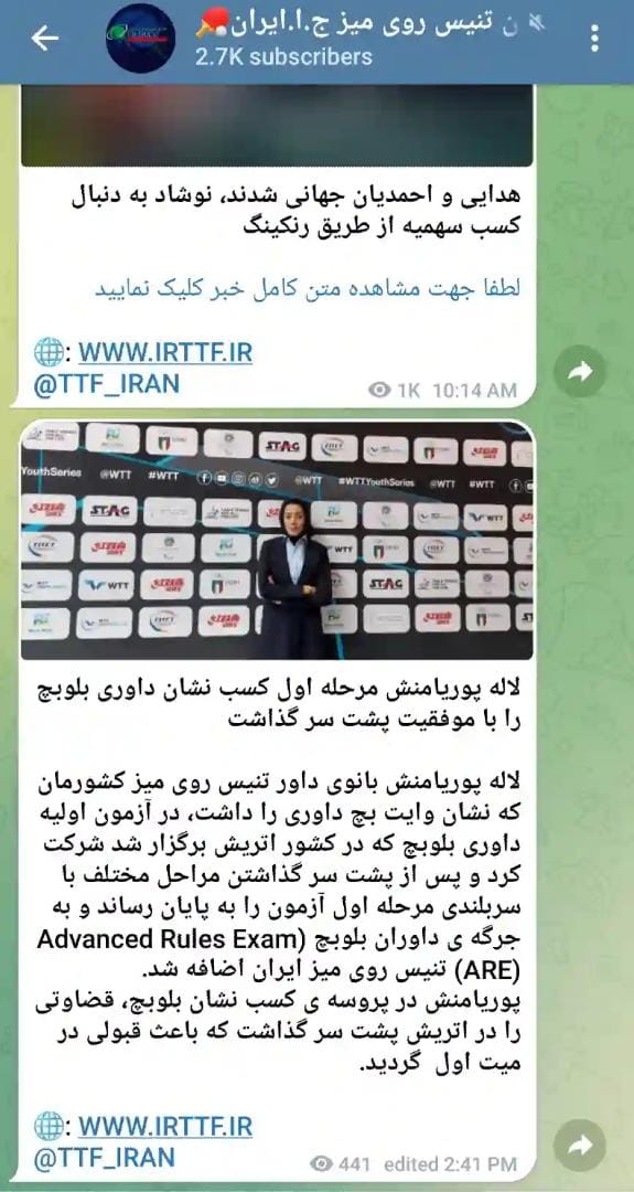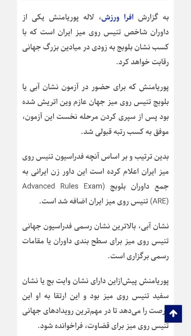 بدین ترتیب و بر اساس آنچه فدراسیون تنیس روی میز ایران اعلام کرده است این داور زن ایرانی به جمع داوران در مرحله بلوبج (Advanced Rules Exam (ARE) تنیس روی میز ایران اضافه شده است.
