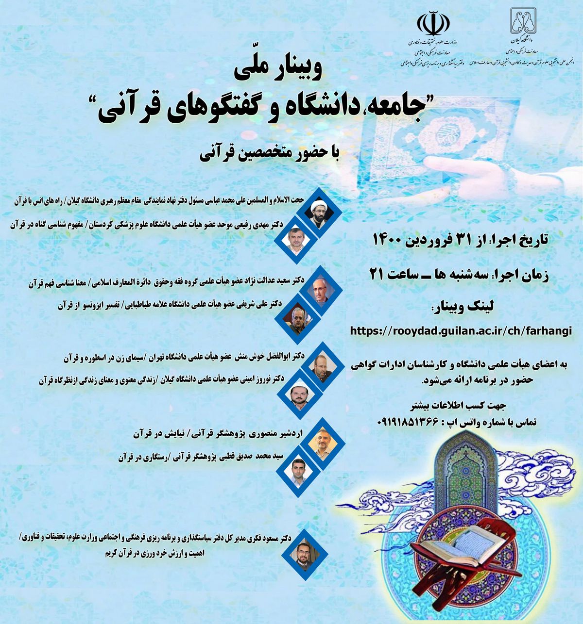 معاونت فرهنگی و اجتماعی دانشگاه گیلان در ایام ماه مبارک رمضان وبینار علمی با عنوان «جامعه، دانشگاه و گفتگوهای قرآنی» با حضور متخصصین قرانی روزهای سه شنبه هر هفته ساعت 21 برگزار می نماید
